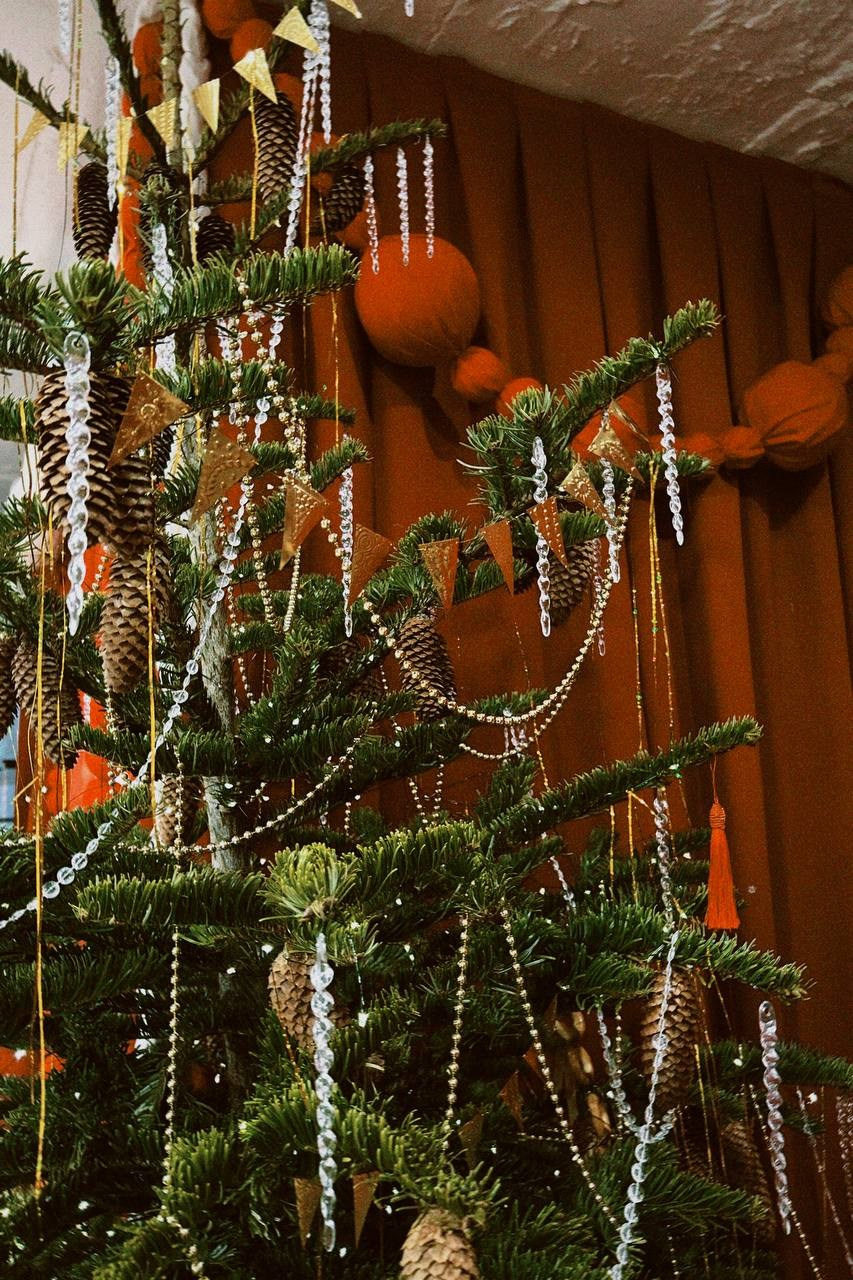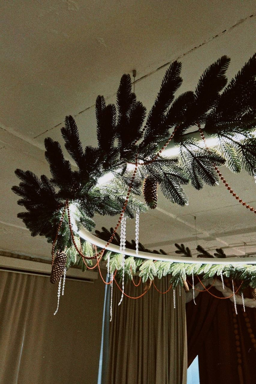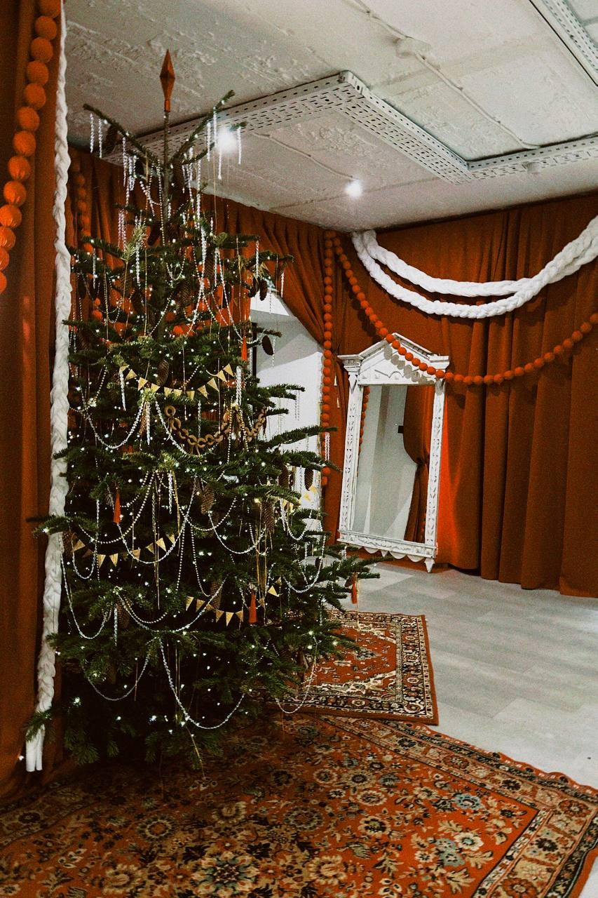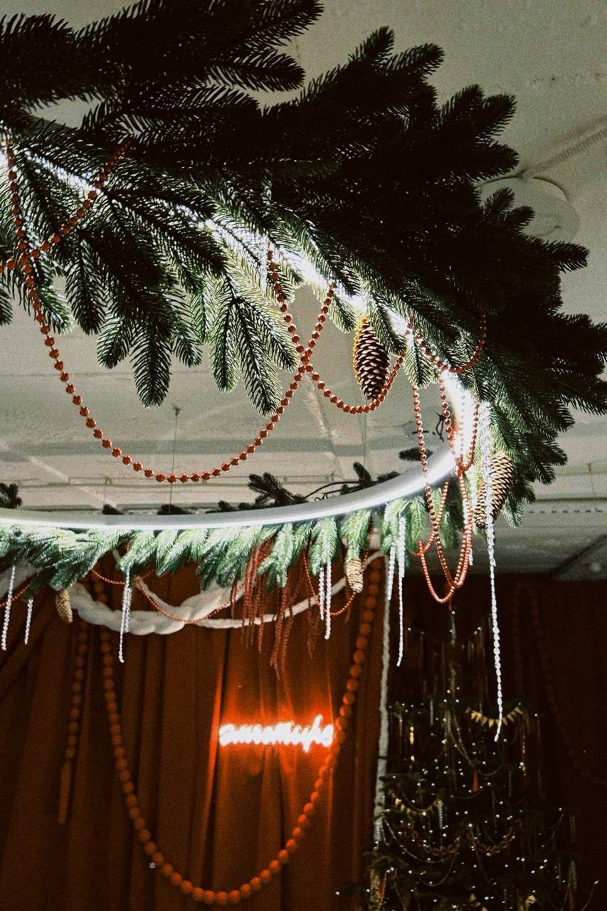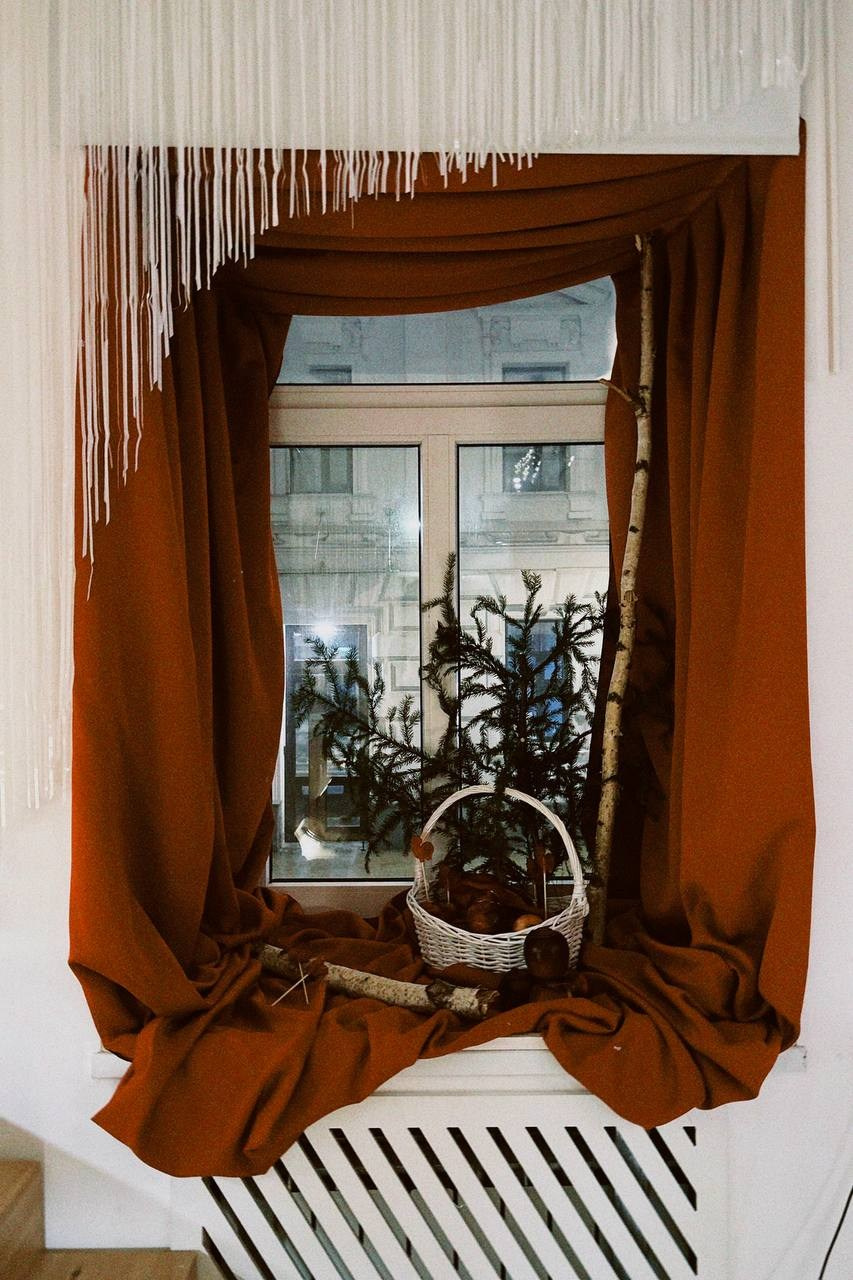 Было сделано: Стены обшиты тканью, сделан декор косы, гирлянды из латуни и сушек, бусы и косы, так же, сделаны в ручную. Созданы композиции на подоконниках — яблоки, корзина, леденцы. Украшена живая ель. Дождиком оформлены зоны, украшена центральная люстра