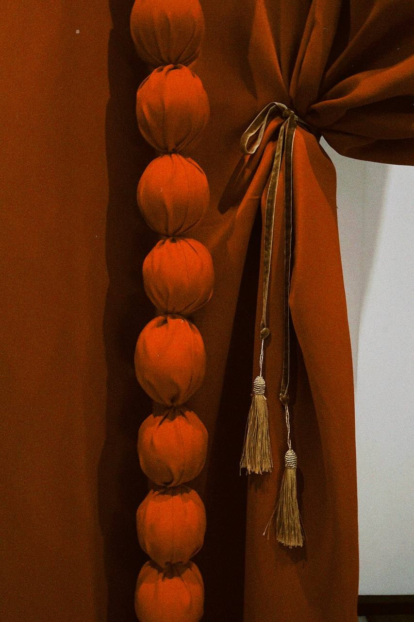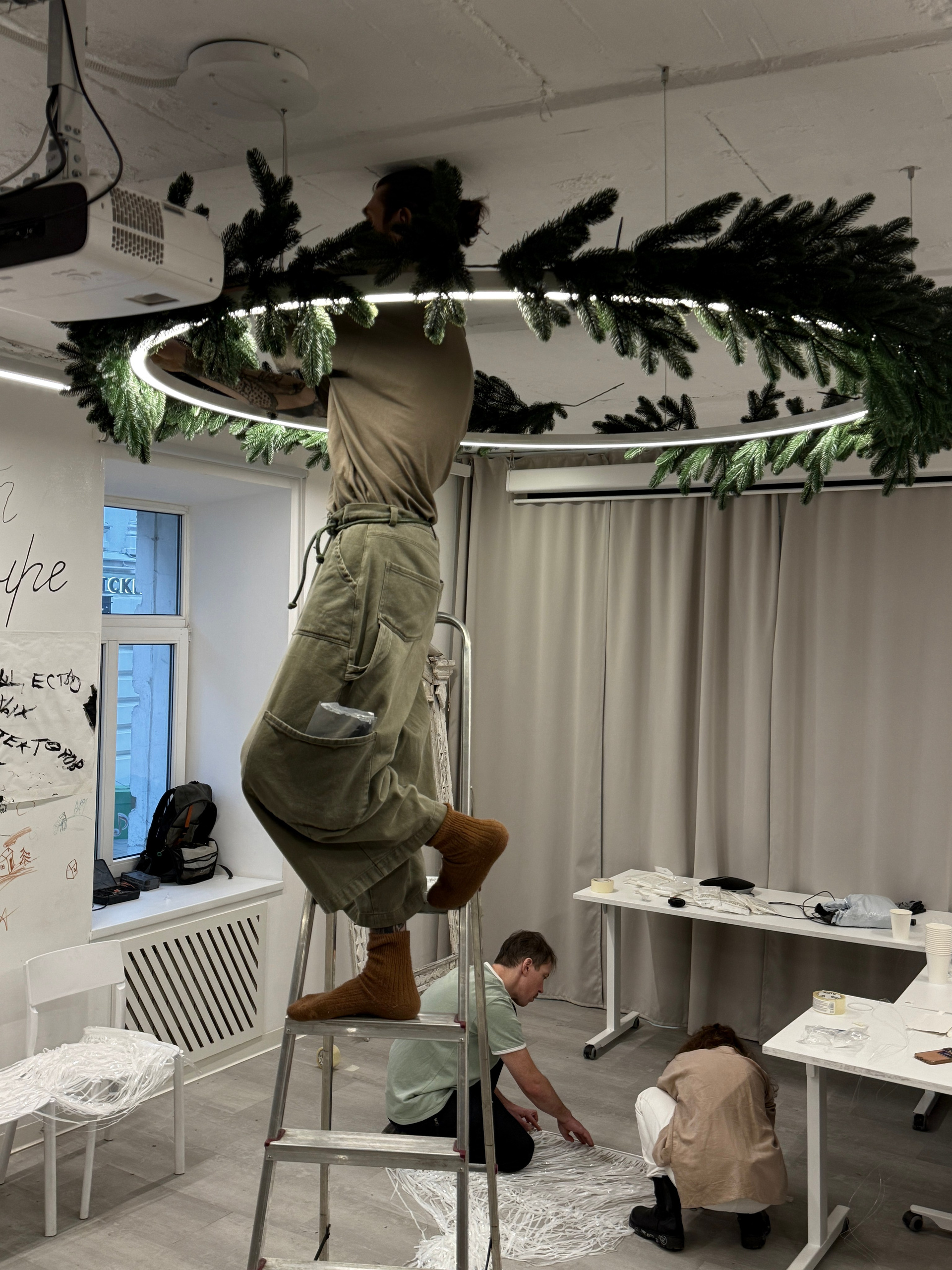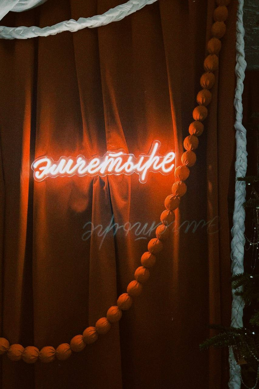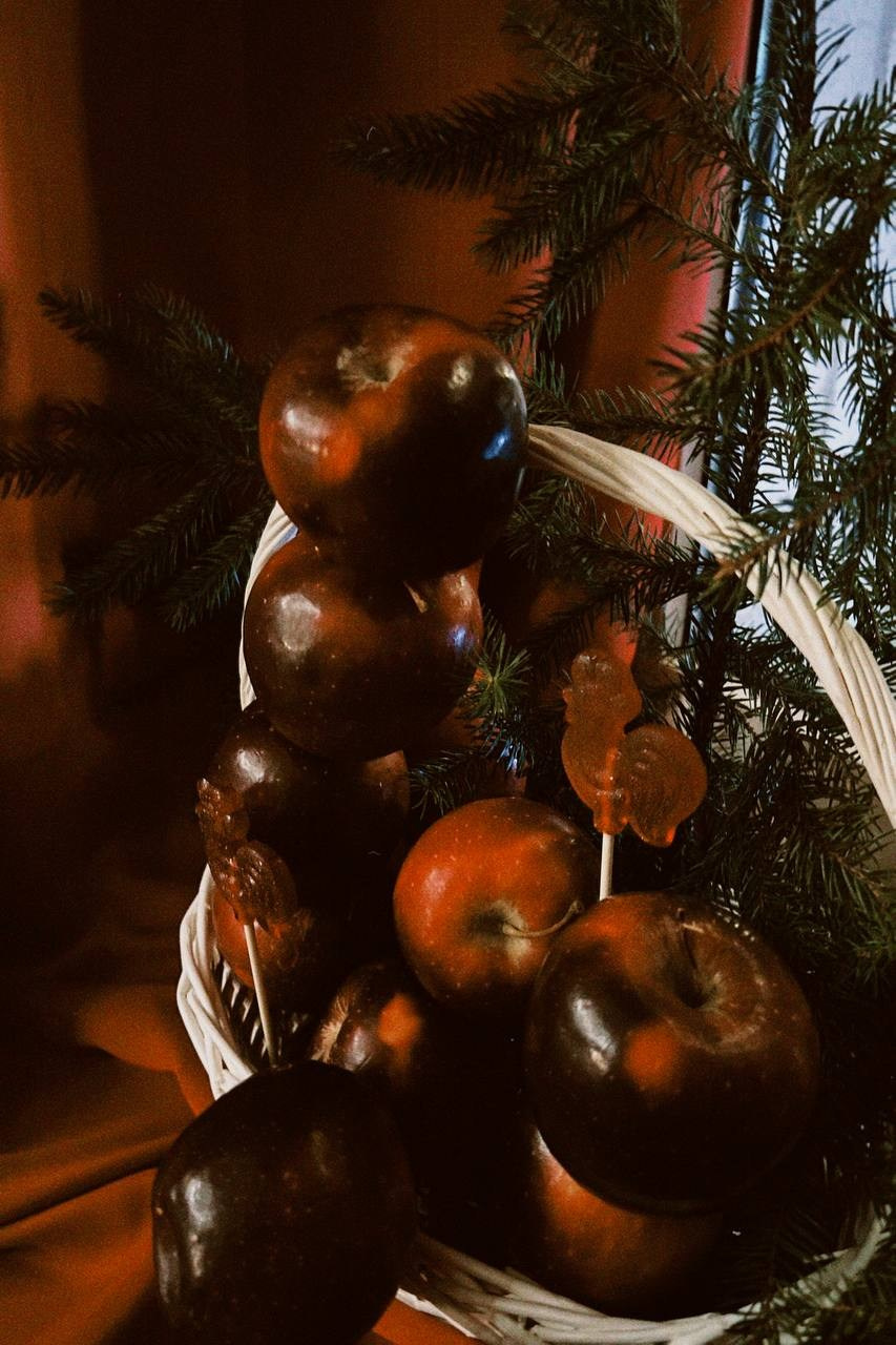 Было сделано: Стены обшиты тканью, сделан декор косы, гирлянды из латуни и сушек, бусы и косы, так же, сделаны в ручную. Созданы композиции на подоконниках — яблоки, корзина, леденцы. Украшена живая ель. Дождиком оформлены зоны, украшена центральная люстра