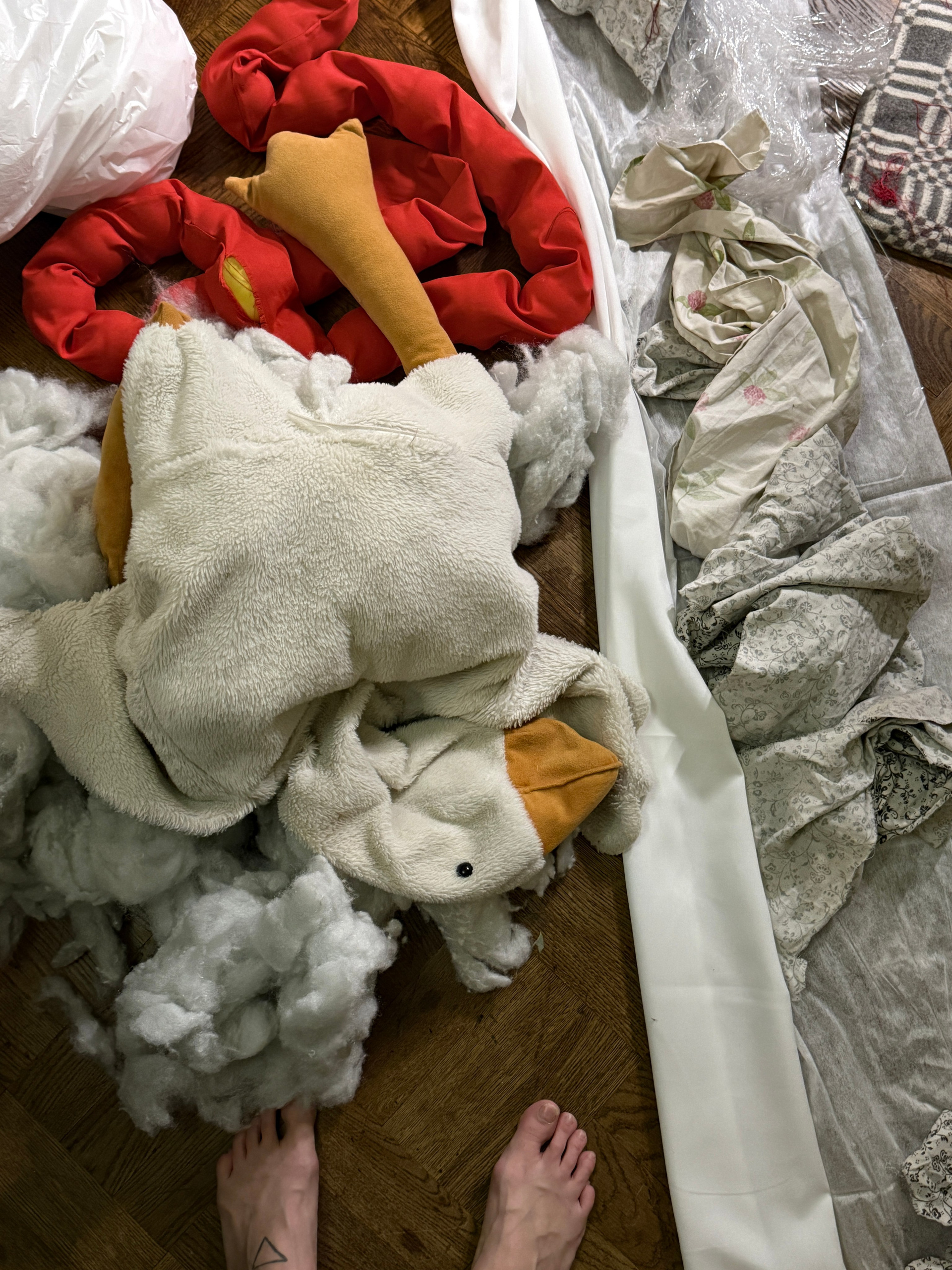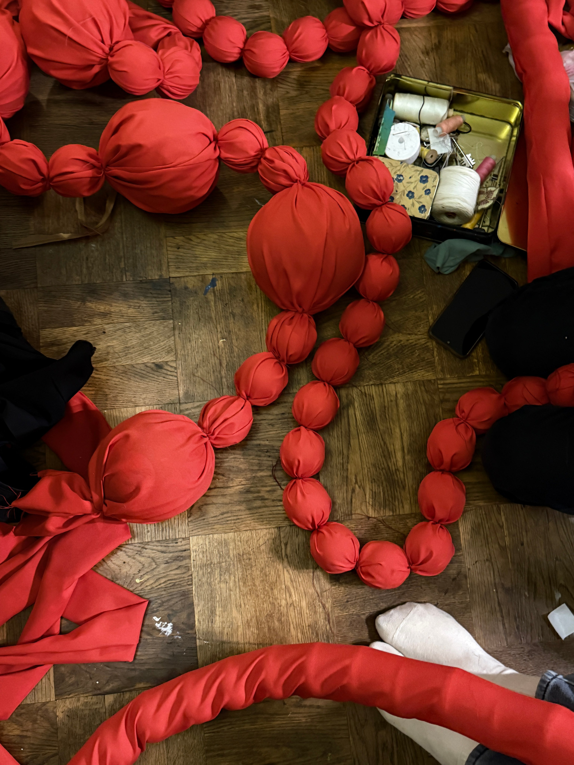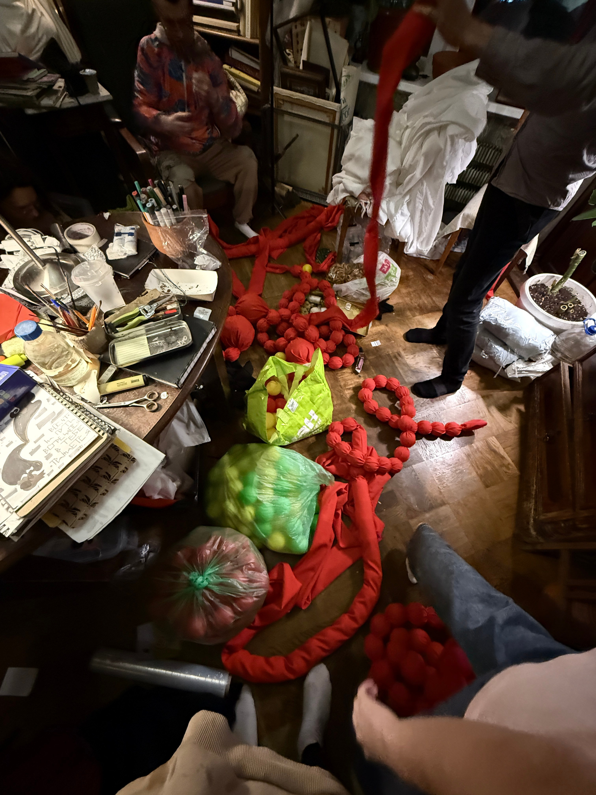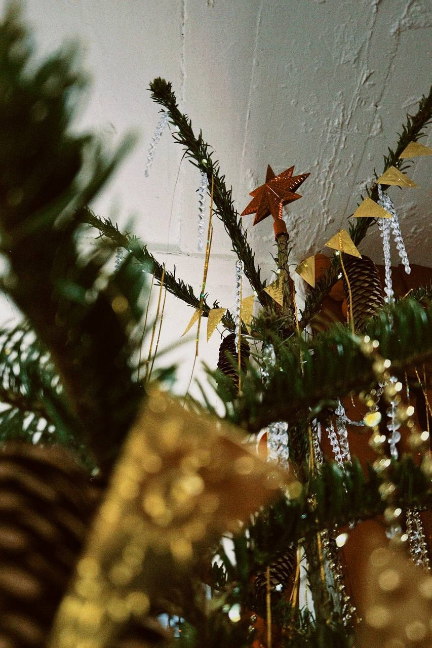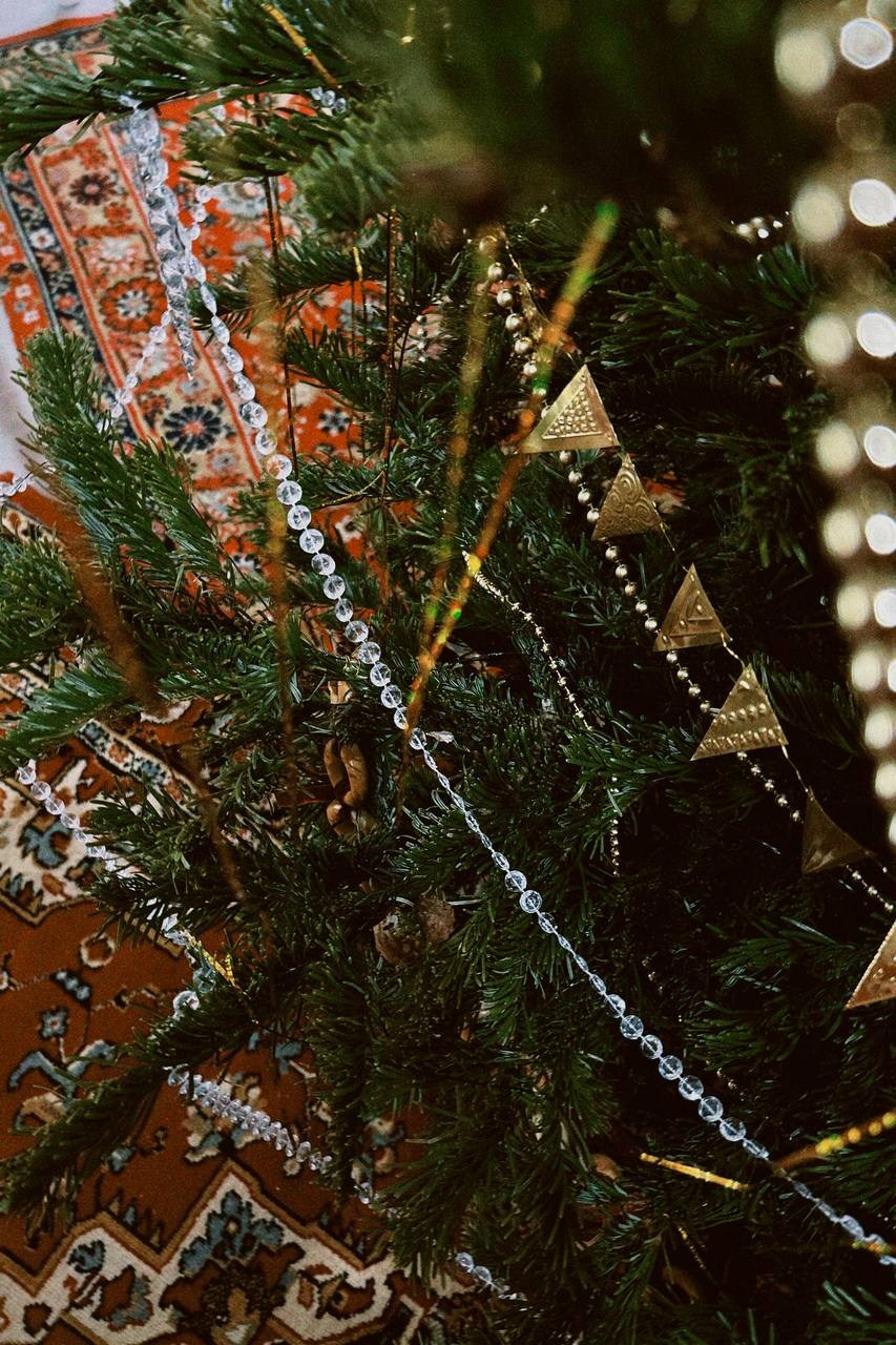 Было сделано: Стены обшиты тканью, сделан декор косы, гирлянды из латуни и сушек, бусы и косы, так же, сделаны в ручную. Созданы композиции на подоконниках — яблоки, корзина, леденцы. Украшена живая ель. Дождиком оформлены зоны, украшена центральная люстра